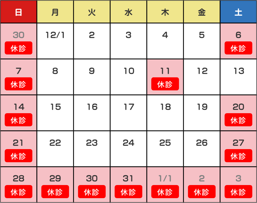 年末年始は12月28日(木)~1月3日(水)まで休診です。