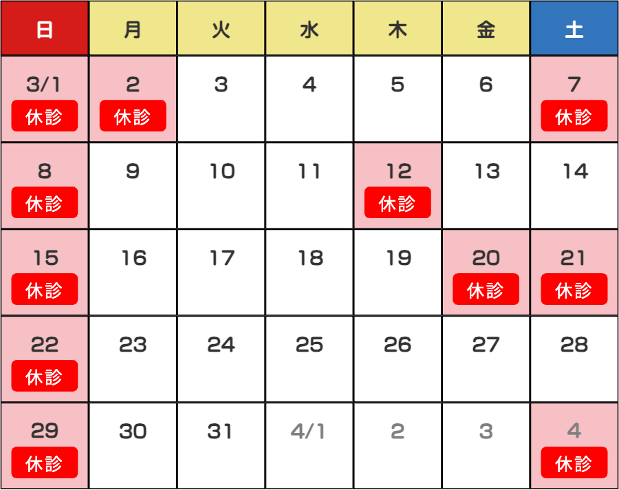 3/2(月)と3/12(木)が休診です。 ご迷惑をおかけしますが、よろしくお願いいたします。